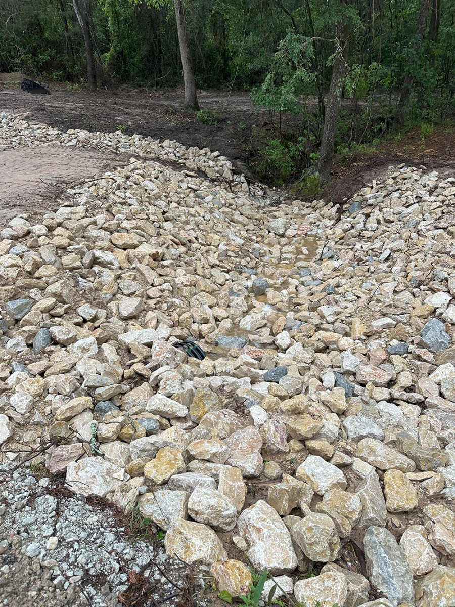 This method is an effective choice for water erosion in ditches. We’ll dig and regrade the ditch and then install in rip rap. We’ll layer the ditch with 6-12-inch stones that will lay in the bottom of the ditch.